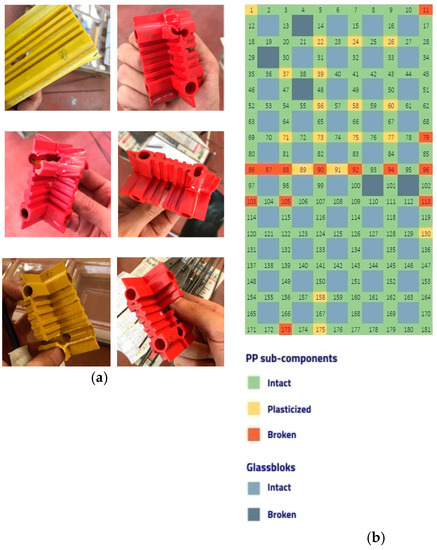 (a) Analysis of sub-components after the breaking strength test: some of the cross shaped profiles made of PP have been damaged. (b) Position of sub-components into the panel colored in accordance to the level of damage.