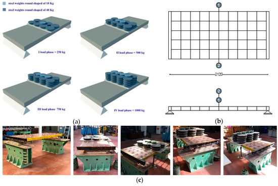 (a) Mechanism adopted for testing the panel. (b) Description of the panel with the micrometer dial gauges position. (c) Pictures took during each of the four load cycles.