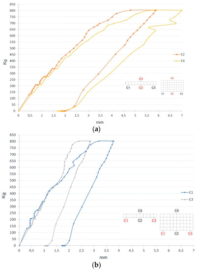 Through the installed micrometer dial gauges, the lowering values of the panel have been recorded in relation to the load gradually applied during the bending tests and the following graphs have been elaborated upon. In the first test described in Section 2.1, the dial gauges positioned in the middle of the panel (C2, C4) and those positioned at 1/6 and 5/6 of the panel length (C1, C3) have shown the trend reported in Figure 11.