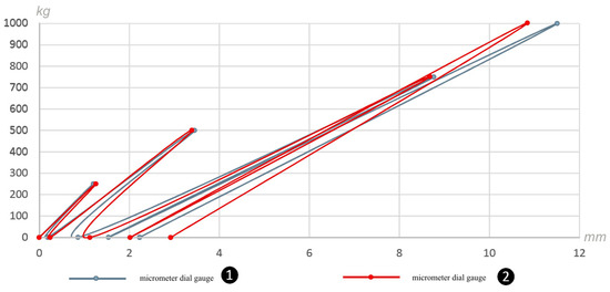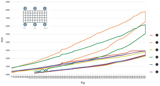 As a result of a second bending test described in Section 2.1, the following graphs related to the 6 micrometer dial gauges installed on the panel have been elaborated upon (Figure 12).