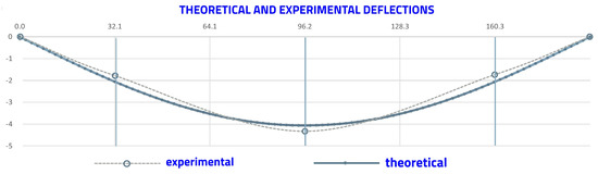A comparison between the theoretical and experimental panel deflections has demonstrated the good response of the panel under load in line with the expected displacements that allow the panel to remain in safe conditions. Without describing in detail the calculations for processing the equation of the elastic line, in Figure 13, one of the comparisons between theoretical and experimental deflections of the panel (carried out for each test) is reported. The theoretical deformation has been obtained by interpolating the displacements derived from the equation of the elastic line. The experimental deformation has been obtained by interpolating the displacements measured by the micrometer dial gauges positioned along the panel at 1/6, 1/2 and 5/6 of its length.
