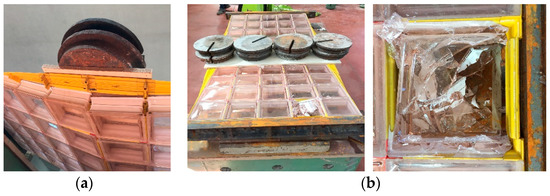 Regarding the breaking tests, the maximum value reached under load has been equal to 1561 Kg even if, under a load equal to 1200 Kg, the panel started to deflate itself plastically but without any breaking of panel subcomponents. The breaking of the panels happened not immediately but after 5 min of load application and it consisted of a differential failure of glass blocks positioned in the middle of panel, the twist of plastic profiles positioned in the panel long sides due to the plasticisation of steel bars (Figure 14a), and the explosion during only one test carried out in Lab. of a glass block (Figure 14b) adjacent to the C-shaped steel profile positioned along one of the panel short sides that represent the zone of greater influence of the pre-stressing force applied to the stiffening steel bars hidden into the panel.