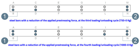 The results of cyclic mechanical testing allowed us to investigate the ability of the panel to maintain the applied pre-stressing force under cyclic loading conditions, which gradually increased. A reduction of the pre-stressing force value has been registered under a load equal to 750 Kg in correspondence of the steel bars positioned in the longer sides of the panel (Figure 16).