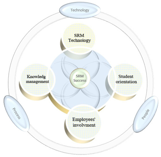 As the discourse on this topic is insufficient [7,13], the inquiry for this investigation is made into the debate about SRM due to its importance, capability, and philosophy. By reviewing the literature, it is found that institutions have mainly perceived the concept as a technological initiative for solving the problems in individual domains, accompanied by uncoordinated efforts. However, there is a lack of understanding about the impacts of other critical factors on the success of SRM. A study has theoretically analyzed the vital role played by knowledge management (KM) initiatives as determinants of the SRM success [7], along with other factors (organizational and technological factors); however, they have yet to address the concept empirically. This indicates that a generally accepted model to guide universities to their successful implementation is still missing, which accords with the investigations of [2,7]. Thus, the aims of this study are to theoretically present the SRM’s critical success factors and to empirically examine the recognized factors based on a research model, which was proposed by Gholami et al. [7]. The proposed model was made on the basis of customer relationship management (CRM) conceptual lenses, whereby confirmatory examinations should be carried out. Consequently, this article contributes to a field which has no empirical evidence in this context.