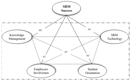 In order to examine the research model, a hypothesis in addition to the aforementioned four hypotheses was developed that allows for the exploration of the relationship between the four critical success factors, as shown below. It should be noted that the following hypothesis is in pursuit of Reference [7], who argued there is a strong correlation between KM, EI, SO, and SRM technology. The mentioned study was conducted based on the investigations that regard the student as a customer; however, there was a body of relevant literature that theoretically and empirically demonstrates the presence of this hypothesis. To be more exact, the findings of Sin et al. [62] supported that these critical factors are significantly correlated. In the current knowledge of SRM strategy, a web of interlocking initiatives, which can institutionalize the concept over time, has also been affirmed [8,9]. Moreover, to succeed in examining the research model (Figure 2), it is necessary to take it into our hypothetical account.