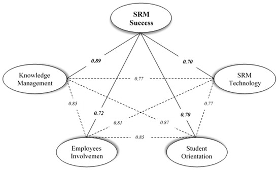 Upon confirmation of the research model (Figure 3), the results indicated that there has been a significant correlation between the SRM success and the four critical success factors since all p-values were found to be less than 0.001 (p < 0.001), as shown in Table 2. However, these factors correlate with SRM success significantly where the strongest correlation coefficient belongs to the “knowledge management” factor (0.886), while the weakest correlation coefficient belongs to “SRM technology” factor (0.696). Furthermore, it is noted that the SRM critical success factors correlate with SRM success significantly in a descending order; knowledge management (ϕ = 0.886), employees’ involvement (ϕ = 0.715), Student Orientation (ϕ = 0.704), and SRM technology (ϕ = 0.696). Table 3 shows that the SRM critical success factors possess a significant correlation with each other as all p-values were less than 0.001 (p < 0.001) and all correlation coefficients exceeded 0.5. Therefore, the resultant five hypotheses in this research are empirically accepted, as illustrated in Figure 3.