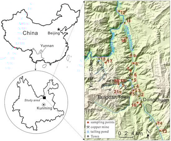 - Huang, Q.-R.; Yang, S.-R.; Cheng, X.-F.; Zhang, X.-Q. Heavy metal pollution characteristics and prevention advice of Xiaojiang River drainage area in Dongchuan, Yunnan. Yunnan Geol. 2017, 1, 134–140. [Google Scholar]