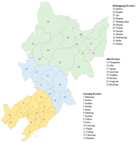 Northeastern China is an important industrial base of China. It covers 788,000 km, accounting for 8.2% of China’s total land area. Three provinces, Liaoning, Jilin, and Heilongjiang, locate in Northeastern China. Liaoning province lies between longitudes 118°53′ E and 125°53′ N, and between latitudes 38°43′ N and 43°26′ E. There are 14 cities located in Liaoning province, with two sub-provincial cities: Shenyang and Dalian. Jilin province lies between longitudes 121°38′ E and 131°19′ N, and between latitudes 40°52′ N and 46°18′ E. It has jurisdiction over 7 prefecture-level cities and one sub-provincial city, Changchun. Heilongjiang province lies between longitudes 121°11′ E and 135°05′ N, and between latitudes 43°26′ N and 53°33′ E. 12 cities locate in Heilongjiang province. Harbin is the sub-provincial city of Heilongjiang. The locations of the total 34 prefecture-level and above cities in Northeastern China are shown in Figure 1.