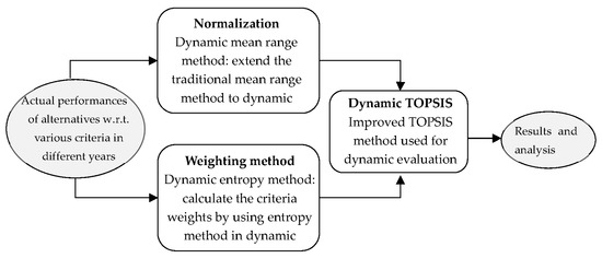 Northeastern China had made important contributions to China’s independent and complete industrial system and national economic system. However, with the deepening of reform and opening up, the institutional and structural contradictions of Northeastern China have become increasingly prominent since 1990. This resulted in many problems hindering the sustainable development of Northeastern China, including severe economic recession, greater social security and livelihood pressures, imperfect private economy, lackluster state-owned enterprises, etc. For example, in the year 2014 to 2015, the economic growth rate of Northeastern China was at the bottom and was 1 to 2 percentage points behind the national average [48]. At present, the revitalization of Northeastern China is a core issue and policy-priority for Chinese government. The primary purpose of the paper is to investigate the dynamic sustainability of the cities in Northeastern China to provide more technology or policy reference for the sustainable development of Northeastern China. To achieve this, the following framework is proposed, as shown in Figure 2, where the key methods are described in the following subsections.