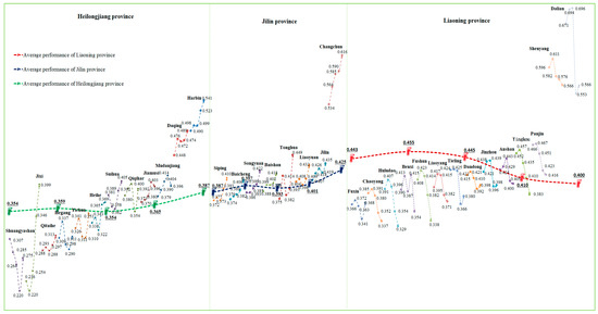 - The sustainability of the cities in Northeastern China was comparatively low in the year 2012 to 2016. Only four sub-provincial cities’ average performances were over 0.5 (accounting for 11.8%), such as Dalian (0.636), Shenyang (0.586), Changchun (0.578), and Harbin (0.510).
