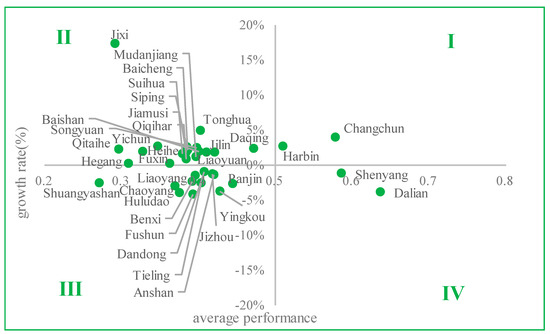 The 34 prefecture-level and above cities in Northeastern China were classified into four clusters by the average performances and growth rates, as shown in Figure 4. The cities located in Cluster I had higher sustainability levels, with average performance values over 0.5, and better development momentum (positive growth rates). The cities located in Cluster II had lower sustainability levels, but showed better development momentum. The cities in Cluster III had the worst performances and negative growth rates. The cities located in Cluster IV had higher sustainability, but their growth rates were negative, indicating the decline of the cities sustainability.
