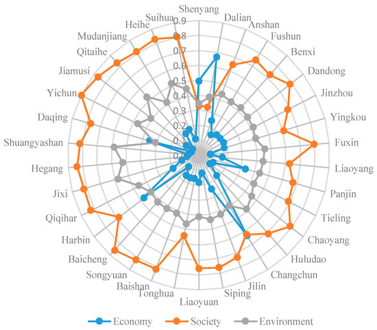 The cities located in Liaoning province had negative growth rates of economic sustainability, indicating the decline of economy in Liaoning province was serious. This was the main reason of the decline of the province’s sustainability. In terms of social sustainability, only one city (accounting for 7.1%) had negative growth rate. Five cities (accounting for 35.7%) had negative growth rates of environmental sustainability. For the cities located in Jilin province, they all had positive and larger growth rates of economic sustainability, with all the growth rates over 10%. Whereas they had negative growth rates of environmental sustainability. In terms of the cities in Heilongjiang province, nine cities (accounting for 75%) had negative growth rates of environmental sustainability, and three cities (accounting for 25%) and two cities (accounting for 16.7%) had negative growth rates of economic and social sustainability, respectively.