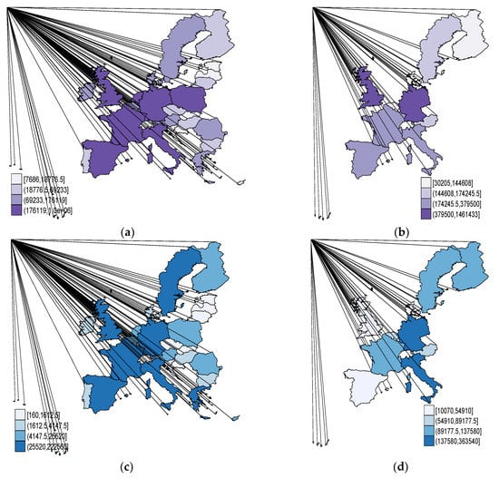 Regarding the international migration indicators (Figure 1a–d), while official data point to relatively high numbers of immigrants (as can be seen from Figure 1a) and asylum seekers (as can be seen from Figure 1c) in EU-10 countries (namely, the United Kingdom, Germany, France, Italy, Spain, Belgium, Austria, Sweden, Denmark, and Finland), the propensity of the migration phenomenon significantly overpasses these numbers. Alongside these selected EU-10 MS, Poland tends to be preferred by labor immigrants in absolute terms, however, if we report to its population, the immigration rate is very small (0.5%) compared to Austria for example, which accounts 1.48%, or Sweden with 1.65% []. Moreover, Poland and Romania are well known as migrant sending countries, analyzed from a different migration perspective (emigration), being rather transitory targeted by immigrants and asylum seekers through the main migration routes []. Among EU-10, Germany and the United Kingdom are mostly targeted by labor immigrants (Figure 1b), respectively Germany and Italy by asylum seekers (Figure 1d), but here Italy is mostly a transition country being targeted through a major migration corridor coming from Libya [].