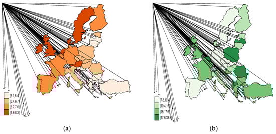 In Europe, subjective wellbeing is significantly high in the Nordic states (especially in Sweden and Denmark), as well as in the United Kingdom, Ireland, Netherlands and Austria, but also to some extent in France and Germany (Figure 3a). On the other hand, Central and Eastern European (CEE) countries are characterized by low levels of contentment with the living standard (particularly Bulgaria and the Baltic States) and increased job insecurity []. Among CEE countries, in Romania, Poland, and Latvia, the perceived probability to lose the current job in the near future (next six months) is at its highest, thus leading to severe unemployment (Figure 3b). These countries also face increased migration challenges, having the largest emigrant stocks, respectively a large part of the labor force employed abroad, mainly targeting EU-10 host economies.