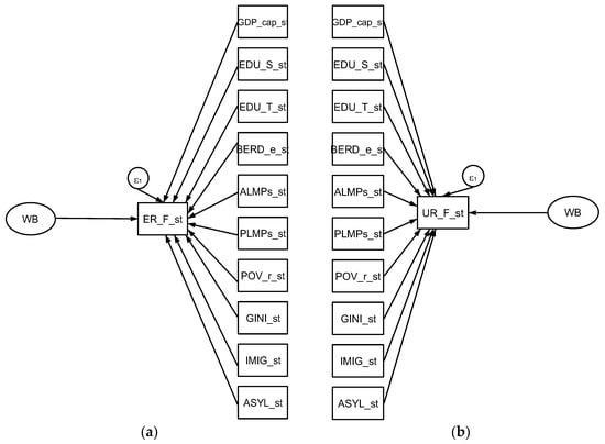 Moreover, in the next stage of the research, SEM (Structural Equations Modeling) models were applied to ensure a proper validity of the estimations performed both for UR_F (Figure 5a), and ER_F (Figure 5b), and reinforce the spatial and macro-econometric results.