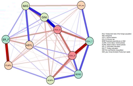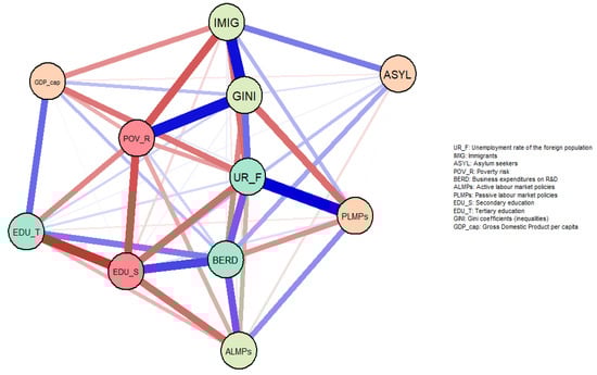 If we consider the ER_F network GGM (Figure 6), we can grasp the peripheral position of ER_F compared to the centrality of UR_F (Figure 7), respectively the direct linkages of ER_F with PLMPs, IMIG and ASYL (H1 and H2). The same strong relation is revealed between IMIG-ASYL and GINI, POV_R, GDP_cap (H4), while the education–research–innovation coordinates (EDU_T, EDU_S, BERD) and ALMPs (which also comprises training and lifelong learning programs) are placed on the opposite side with ER_F. Thus, it can be stated that even though these latter coordinates are important, they need to be rebuilt in order to support long-term sustainability of immigrants’ labor market performance, by ensuring a proper insertion and increased job security.