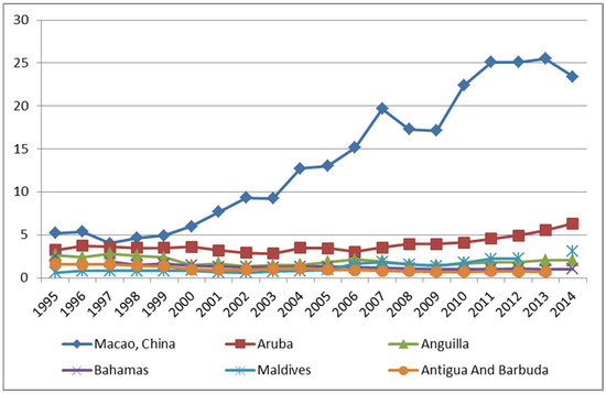 Secondly, it is emphasised that the region with the highest tourism intensity in the world is Macau, a destination that focuses its economy on gambling, as it boasts numerous casinos in its territory. The TII is 6656, the mean between 1995 and 2015 (100 would be the mean world value), with a TD of 48,726 tourists per km2 in 2014. The case of Macau is not unique; in fact, another relevant conclusion is that island economies are the ones with the greatest TII. In this regard, the present study follows the lines marked in a previous one [36], in which it was also determined that the highest tourism densities in the world were found in archipelagos and, specifically, in the Cayman Islands, British Virgin Islands, and the Balearic Islands.