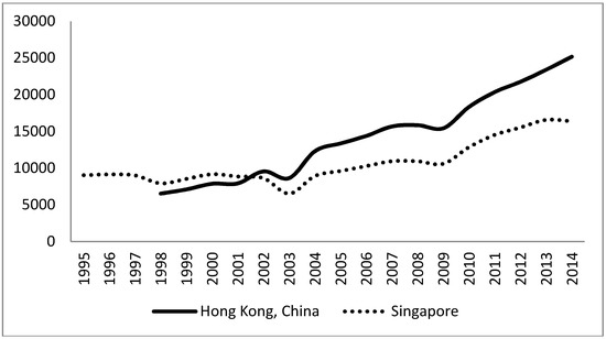 Far behind, but still classified as having very high tourism density, we find Hong Kong and Singapore, whose evolution from 1995 to 2015 is shown in Figure 3. Hong Kong goes from a density of 6532 tourists per km2 in 1998 to 25,183 tourists per km2 in 2014, namely, 285.5% growth over the period (Table 13). Singapore goes from 9034 tourists per km2 in 1995 to 16,390 in 2014, up 81% (Table 13).