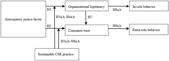 A positive history of CSR efforts offers a halo effect in protecting corporate brand image and creating credibility and trust [106]. Several studies have concluded that consumer response to CSR efforts can both build and protect corporate brand image, trust, and behavioral intentions [106,109,110,111] against service failures. Hence, corporations that engage in the process of anticipatory justice to recover corporate legitimacy and consumer trust are likely be moderated by sustainable CSR practice. The following hypotheses are proposed:
