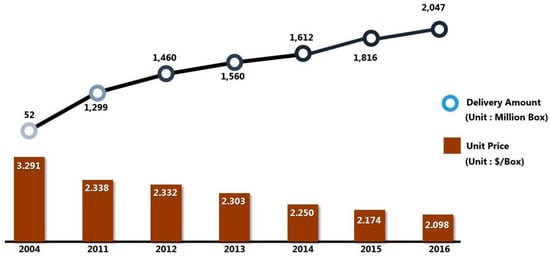 A rapid increase in indirect purchases is accelerating a steep surge of express delivery service market. This incremental result is mainly due to an increasing consumption through online-based transactions such as internet shopping, mobile shopping and TV home shopping, which has naturally led to a growth of express delivery services. Figure 1 shows the recent trend for the courier market in Korea. It is observed that the courier amount has continuously been growing year by year. On the other hand, the unit price has been dropping due to the greater competition among courier service providers []. At the end of the day, the express delivery companies with low market share are not likely to survive in competitive market and cannot help avoiding collaboration for increasing their market shares company. More than 80% of market is occupied by only five companies and especially, about 67% is by three companies and a big on covers 45% of entire market [].