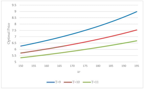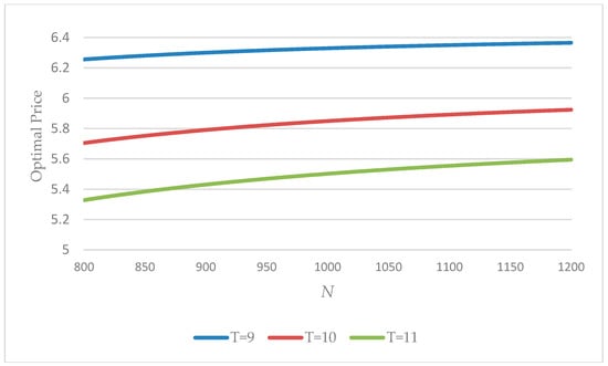 Variation of the optimal price with N for different values of T (w = 150).