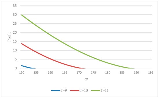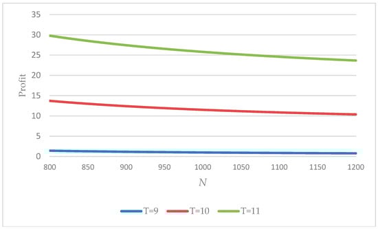 Variation of the profit with N for different values of T (w = 150).