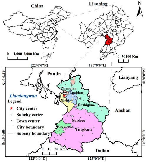 The Yingkou region (39°55′ N–40°56′ N and 121°56′ E–123°02′ E) is in the Northwestern part of Liaodong Peninsula, China (Figure 1). The region covers 527,500 ha, and mountainous areas account for approximately 50% of the area. Benefiting from these topographic and geography features, the area has abundant forest and wetland resources, making up about 46% and 6% of the total area, respectively [41]. Over the past 15 years, the region has undergone remarkably rapid economic growth and urbanization, and a considerable decrease in forest land and wetlands [41]. Therefore, the natural resources should be analyzed and monitored in Yingkou, to protect natural environment and ecosystem processes.