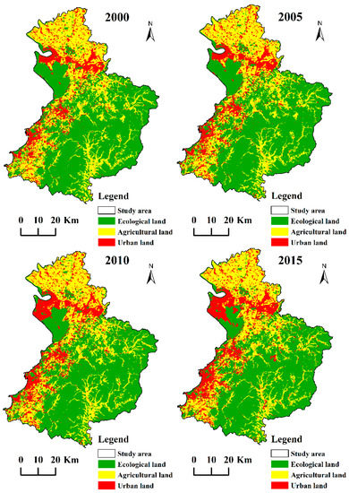 The land use/cover data with a pixel size of 30 × 30 m in 2000, 2005, 2010, and 2015 were sources from the study of Liu et al. (2016) and Zhang et al. (2017), interpreted based on Landsat Thematic Mapper images and Google Earth maps using the ENVI 5.1 software. These land use/cover maps represent the same data sources, processing methods, and classification systems, and they are the most appropriate data to identify changes in land use/cover. Overall accuracies were approximately 90% and the Kappa coefficient was 0.8 [41,42]. The land use/cover classification system included cropland, forest land, urban land, wetlands, and other land. In this classification, other land comprised grassland, bare land, and so on, which are less disturbed by human activities. In this study, the land use/cover classes were divided into three sub-types (i.e., ecological, agricultural, and urban lands) according to their land functions, and natural or human disturbance characteristics using the ESRI ArcGIS 10.2 software. Ecological lands, including forest land, wetlands, and other natural land provide ecological goods and services, and have natural characteristics [5]. The spatial distribution of land use/cover types is shown in Figure 2.