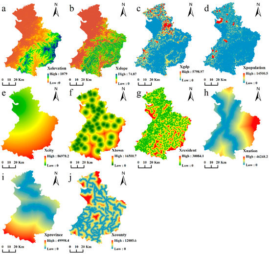 Landscape change is affected by distinct combinations of cultural, political, and natural drivers [46]. Many studies have recognized the analytical framework of the influencing factors of ecological land change, the variables of which were considered in the survival analysis in the current study with the available data (Table 1 and Figure 3). (1) Elevation and slope are generally restrictive factors of ecological land, which may change in the area with flat slope and low elevation [8]. (2) Two socio-economic factors, population and GDP [5,8], affect land change because the conflict between regional construction land and ecological protection increases with rapid urbanization and economic development. (3) Three proximity factors; namely, distance to city, distance to towns, and distance to residential lands [8,11,18], affect ecological lands through locational effects on a small scale; that is, ecological lands near intensive human activity areas are expected to be most greatly affected by the living and production benefits of human beings. (4) Three accessibility factors, namely, the distance to national, province, and county ways [21] impact land use/cover in promoting the land use/cover demand of different populations by influencing the land price. All variables were normalized into [0, 1] with a z-score standardization method and used as the data for determining the drivers of ecological land change.