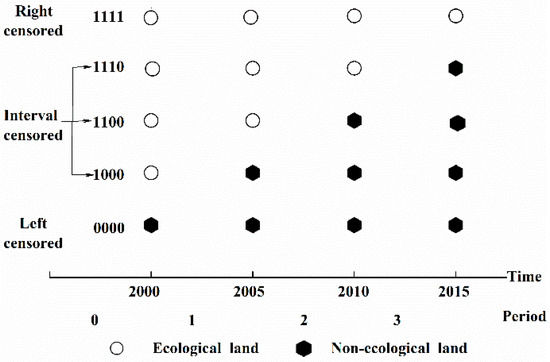 The time variable t was discretized into several periods (2000–2005, 2005–2010, and 2010–2015) according to land use/cover, due to the difficulty in obtaining the time of land use/cover change. The changing state of ecological land loss was coded as a chain: 0000, 1000, 1100, 1110, and 1111. The model requires the observations to be censored, such as left, interval, and right censored data [34]. The forms of censored observations depend on whether and when the ecological land loss occurs (Figure 4). A combination of systematic and random sampling schemes was used to minimize autocorrelation, and to maintain the representativeness of the samples [33,49].