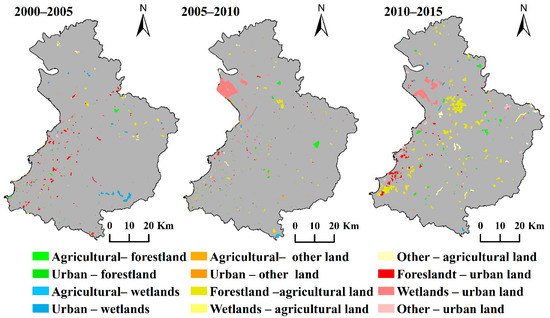 The amount of land use/cover changed between ecological land and non-ecological land during 2000–2005, 2005–2010, and 2010–2015 are shown in Table 2 and Table 3. Ecological land was the main land use/cover type and it accounted for over 50% of the total area in four years. Forest land was the main component of ecological land, followed by wetlands. It accounted for over 80% of the ecological land. The proportional area of ecological land decreased from 55.02% to 51.76%, with an area of 17,110.6 ha. Each type of ecological land showed a decreasing trend except for water in 2005 and other lands in 2010.