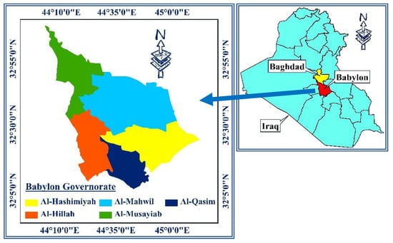The Babylon Governorate lies in the middle part of Iraq, about 100 km to the south of Baghdad (the Iraqi capital), between latitudes 32°5′41″ N and 33°7′36″ N and between longitudes 44°2′43″ E and 45°12′11″ E (Figure 1). The area of the Babylon Governorate is 5337 km2, and its population is about 2,200,000 []. Administratively, the Babylon Governorate has five major districts (locally called Qadhaas). These districts are Al-Hillah, Al-Mahawil, Al-Hashimiyah, Al-Qasim, and Al-Musayiab. Each district is divided into small cities, and, in total across the five districts there are 16 small cities that are administratively linked to major districts.