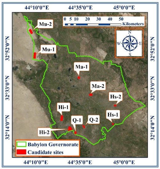 Figure 2 shows the symbols of the chosen location in the Babylon governorate (two sites for each district). These symbols represent the Al-Hillah district (Location 1 (Hi-1) & Location 2 (Hi-2)), the Al-Qasim district (Location 1 (Q-1) & Location 2 (Q-2)), the Al-Hashimiyah district (Location 1 (Hs-1) & Location 2 (Hs-2)), the Al-Mahawil district (Location 1 (Ma-1) & Location 2 (Ma-2)), and the Al-Musayiab district (Location 1 (Hu-1) & Location 2 (Hu-2)) [].