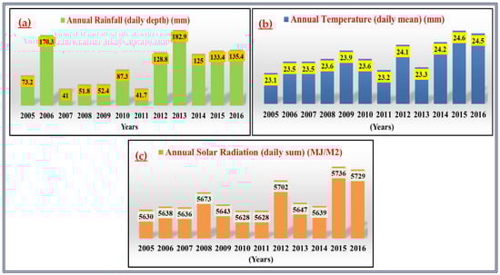 Average annual readings for 2005–2016 of (a) rainfall, (b) temperature, and (c) solar radiation.