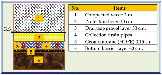 The aim of implementing a bottom barrier layer within the landfill is to avert or reduce the contamination of soil, surface water, as well as groundwater by leachate or having polluted water generated from the landfill locations [,]. The bottom barrier layer acts to filter the leachate materials within it and to avoid the lateral surface flow of leachate []. The bottom barrier consists of composite materials of compacted soils, which have a low permeability.