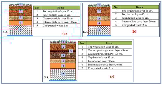 In this study, the suggested design of the final cover system comprises three scenarios. In the first scenario, the evapotranspiration soil cover (ET) (capillary barriers type) was used. This type of cover system is the one most applied recently for landfills in arid areas in the USA and other developed countries [,].