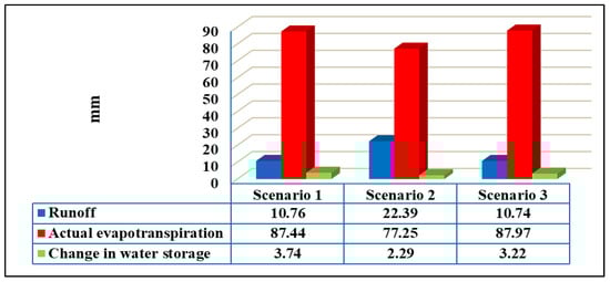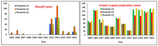 In this model, annual runoff values in the second scenario were higher than the values in the first and third scenarios, which were close to each other. Furthermore, the values of the actual evapotranspiration for the first and third scenarios were almost equal and more than the values in the second scenario (Figure 7). For all three scenarios, most values of actual evapotranspiration during the chosen period (2005–2016) were higher than runoff values, except for some years in the second scenario where the runoff values were higher than those of the actual evapotranspiration due to a high amount of rainfall.