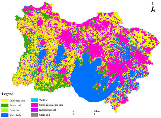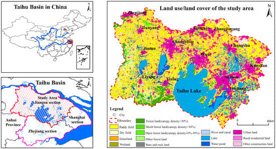 Jiangsu section of the Taihu Basin region (30°45′36″–32°15′04″ N, 119°03′14″–121.17′56″ E) covers a total area of 19,289.52 km2 and is located in Yangtze River Delta of Eastern China (Figure 1). This area includes Suzhou, Wuxi, Changzhou, and a small part of Zhenjiang and Nanjing City, which belong to an independent water conservancy region delineated by the Chinese Ministry of Water Resources. The region has a typical subtropical monsoon climate with an annual mean temperature of 15–17 °C and annual mean rainfall of 1180 mm [10,45]. The study area is one of the most populous and developed regions of China, with a population of more than 22 million. Moreover, this area produced 5.2% of China’s gross domestic product (GDP) in 2010 according to the 2010 China census. The dominant land cover is cultivated land, covering 45.97% of the study area. Due to rapid urban sprawl, the area of agricultural land has been decreasing since 1985 [46,47]. Forest and grassland, accounting for 5.55% and 0.13%, respectively, are mainly located in the mountainous areas in the south and around lakes (Figure 1).