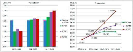 The results indicated that the average annual temperature would significantly and rapidly increase in the future under the high emission scenario. Compared with the baseline scenario (16.062 °C), the temperature would increase by 0.759–0.86 °C in 2011–2040, 1.199–2.385 °C in 2041–2070, and 1.132–4.075 °C in 2071–2100. There were fewer differences among the three emission scenarios in 2011–2040, but the differences were distinct in 2041–2070 and 2071–2100. In the RCP2.6 scenario, the average annual temperature slowly increased and fell in the long term. However, in the RCP8.5 scenario, the temperature rapidly increased and reached 20.137 °C in 2100, exceeding the values in the RCP4.5 and RCP2.6 scenarios by 2.023 °C and 2.943 °C, respectively.