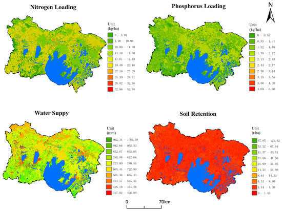 Due to the major threats to water quality and water yields in the Taihu Basin region, we studied four important ESs, including nitrogen and phosphorus purification services and water supply and soil retention services. A set of biophysical indicators that represent the ecosystem functions that benefit humans were used as ES metrics [53]. Biophysical models and empirical estimations were applied to quantify and map the ES indicators. The details are introduced as follows.