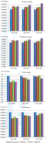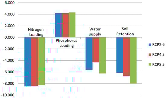 We simulated the combined effects of land use and climate changes on ESs in the medium term (2041–2070) because climate change had few impacts on land use during this period [85]. Due to the uncertainty of the physical environment and human activities in the future, the annual average climate factors in 2041–2070 together with land use in 2040 were used as input variables for the ESs model. The annual average amounts of ESs under the RCP2.6, RCP4.5, and RCP8.5 scenarios, as well as the change ratios compared with the baseline scenario, were shown in Table 4 and Figure 6.