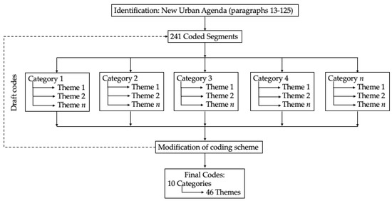 We analyzed the New Urban Agenda through inductive coding of the document’s themes. Using MAXQDA12 qualitative analysis software program, we coded emergent themes from the NUA’s paragraphs 13–125. After creating an initial set of draft codes, we refined each code, tracked the number of instances that each appeared in the text, and organized the thematic codes under broader categories. Figure 1 overviews the methodological framework for this analysis.