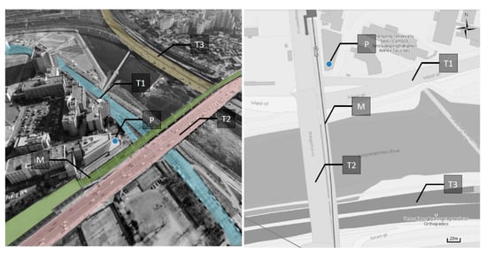 Field measurement area and traffic conditions (source: http://map.naver.com). (a) Birdseye view and (b) aerial map of the measurement location. ‘T’, ‘M’, and ‘P’ indicate the traffic road, metro lane, and measurement unit, respectively. T1 (four lanes), T2 (six lanes), and T3 (ten lanes) are 36 m, 42 m, 330 m away from the measurement unit, respectively. M (two lanes) is immediately adjacent to the measurement unit.