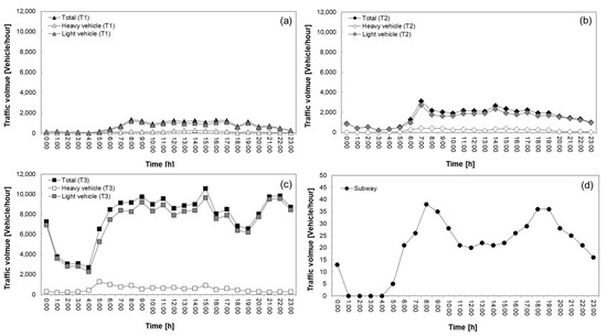 The temporal variation in traffic volume (vehicle/hour, v/h) over the measurement period from three different road sections and the metro lane are plotted in Figure 4. According to the Korea highway traffic noise prediction model (KHTN), the vehicles were classified into two types: heavy (gross vehicle weight ≥ 2.5 t) and light (gross vehicle weight < 2.5 t) vehicles. As shown in Table 2, the percentages of light and heavy vehicle types for the three road sections were similar across the measurement period. The proportion of light vehicles was more than seven times higher than that of heavy vehicles across the three road sections. The standard deviations of the traffic volumes of light and heavy vehicles for T1 and T2 were approximately 6%, while that for T3 was approximately 4%, indicating that the proportions of light and heavy vehicle types for the three road sections were consistent across the measurement period.