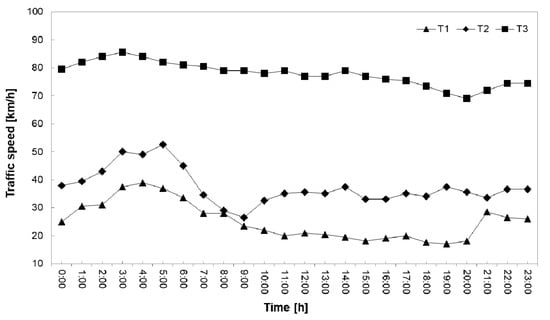 In Period 1, the traffic speed on T2 decreased significantly from 45.0 km/h to 23.5 km/h due to the morning rush (06:00–09:00) and almost constant traffic speeds were recorded with a value of approximately 34.3 km/h. The traffic speed on T3 showed a similar temporal tendency with that on T2 during the period of 09:00–20:00, while a sudden increment of the traffic speed was observed during Period 2 (20:00–21:00). In general, the traffic speeds in Period 3 were higher than the other periods for all of the traffic roads.
