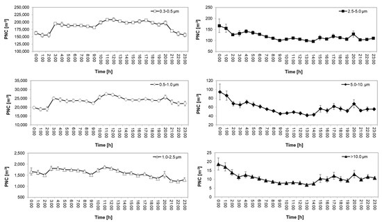 The particle number size distributions in six size ranges (0.3 to >10 μm) were collected during the measurement period as shown in Table 4. The hourly averaged values of the particle number sizes are shown in Figure 6. It was found that the diurnal tendencies of the measured PNC were different depending on the particle size. In general, there are two temporal patterns for the particle sizes. Smaller particles between 0.3 and 1.0 μm tended to decrease during the periods of 0:00–02:00 and 21:00–23:00 and tended to peak around noon (11:00–12:00). In contrast to the smaller particles, the larger particles from 2.5 to >10.0 μm gradually declined during the working hours before peaking at midnight and then tended to slightly increase in the night time.