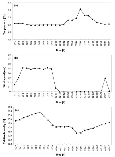 Table 5 presents the measured meteorological indicators across three measurement periods. During the sampling period, the ambient temperature was almost constant in the range from 5.0 to 6.1 °C (mean = 5.2 °C, SD = 0.3 °C) as shown in Figure 7a. The wind speed showed small variations ranging from 0.0–0.5 m/s, as plotted in Figure 7b. Additionally, there was no wind during the measurement period of 12:00–22:00. According to the Beaufort wind-force scale [47], the wind speed (mean = 0.2 m/s, SD = 0.2 m/s) across the measurement period can be described as calm. RH showed large variation during the measurement period as shown in Figure 7c. In Period 1, RH decreased from 54.4% to 39.6%. During period 1 and 2, RH gradually increased by 58.5%.