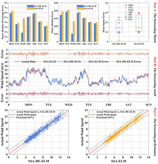 From Part A, our proposed combined model achieved the most accurate results compared with other models in these days because of the lower MAE values. It also shows that the forecasting of SSA-DE-ELMNN had better performance than other models, because the learning speed of ELMNN is extraordinarily fast. ELMNN had better generalization performance in feed-forward neural networks and tended to achieve solutions directly without these trivial problems [