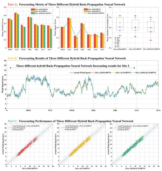 Table 4, the hybrid SSA-APSOACO-BPNN model is superior to SSA-APSO-BPNN and SSA-ACO-BPNN according to the values of MAE, MSE, and MAPE. In addition, the MAPE of the SSA-APSOACO-BPNN is 6.08%, 3.67%, 4.62%, 4.90%, 5.55%, 4.21%, and 3.21% from Monday to Sunday in site 1, respectively. What we could find is that SSA-APSOACO-BPNN not only obtained high accuracy and stability, but also improved the time series wind speed data suited to be forecasted by this model. From the experiments, we can determine the MAE, MSE, AE, and MAPE and whether the proposed SSA-APSOACO-BPNN achieves the best performance in most of tome. It can be seen that, SSA-APSO-BPNN achieved better performance in Sunday of site 3 and SSA-ACO-BPNN obtain better results in Tuesday of site 2 and Saturday of site 3.