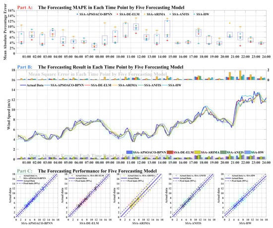 Remark: To further demonstrate the comprehensive performance of the method at different sites, additional 10-min time series wind speed data were generated from four observation sites. Figure 5 and Table 4 show the forecasting results of Sites 1–4 in a week. But the differences are not great. In brief, it can be explained that SSA, which is able to denoise the time series wind speed data as a preprocessing method, and the APSOACO algorithm, which has better ability to detect optimizing weights, threshold, and bias value for BPNN, can improve forecasting accuracy. Furthermore, due to the vertical dataset selection method, the structure of the dataset is optimal, BPNN can reach the minimum error effectively. 4.4. Experiment III: The Performance of Linear Models and Nonlinear Models at Each Time Point